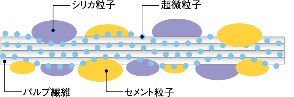 屋根材の基材には主原料となるセメントにパルプ繊維とシリカ粒子、そしてパルプ繊維の補強効果を高めるための超微粒子を配合。長期間にわたり安定した強さを保ちます。