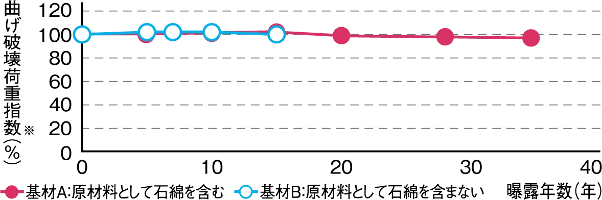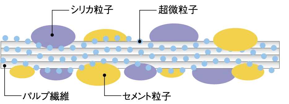 屋根材の基材には主原料となるセメントにパルプ繊維とシリカ粒子、そしてパルプ繊維の補強効果を高めるための超微粒子を配合。長期間にわたり安定した強さを保ちます。